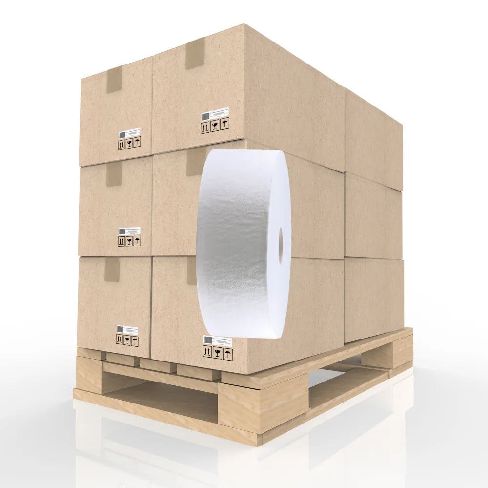 Palettenangebot mit 288 Toilettenpapier-Großrollen (2-lagig, hochweiß, 360m, 90mm) – professionelle Jumborollen für Sanitärbereiche mit hohem Durchlauf in Gastronomie, Büros und öffentlichen Einrichtungen.